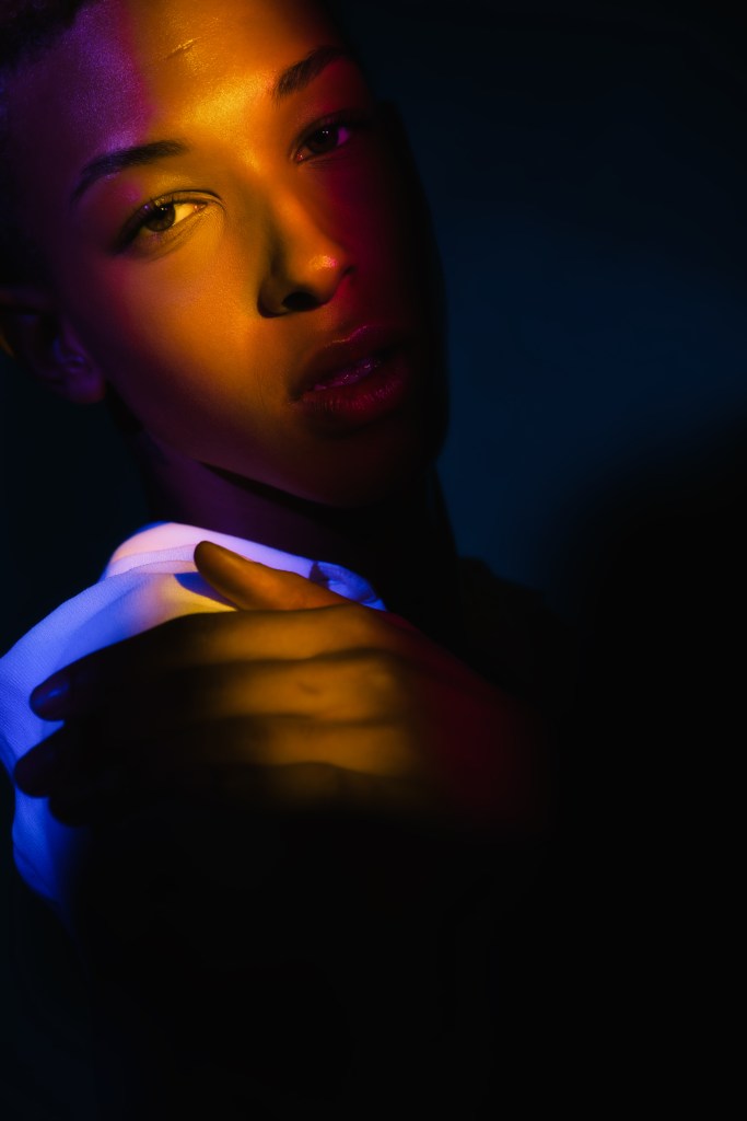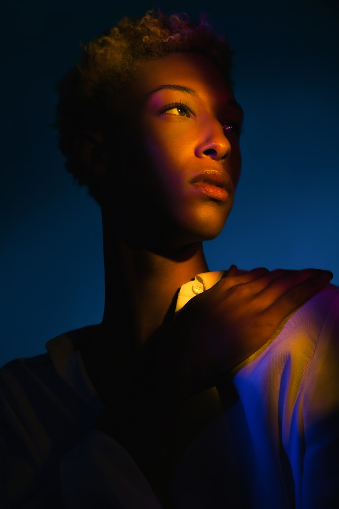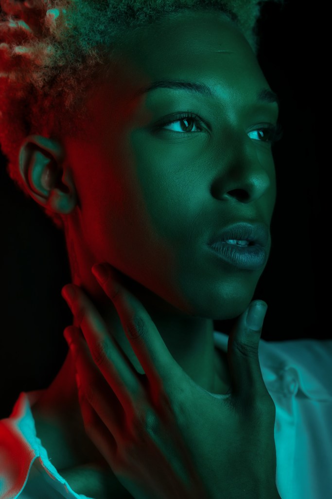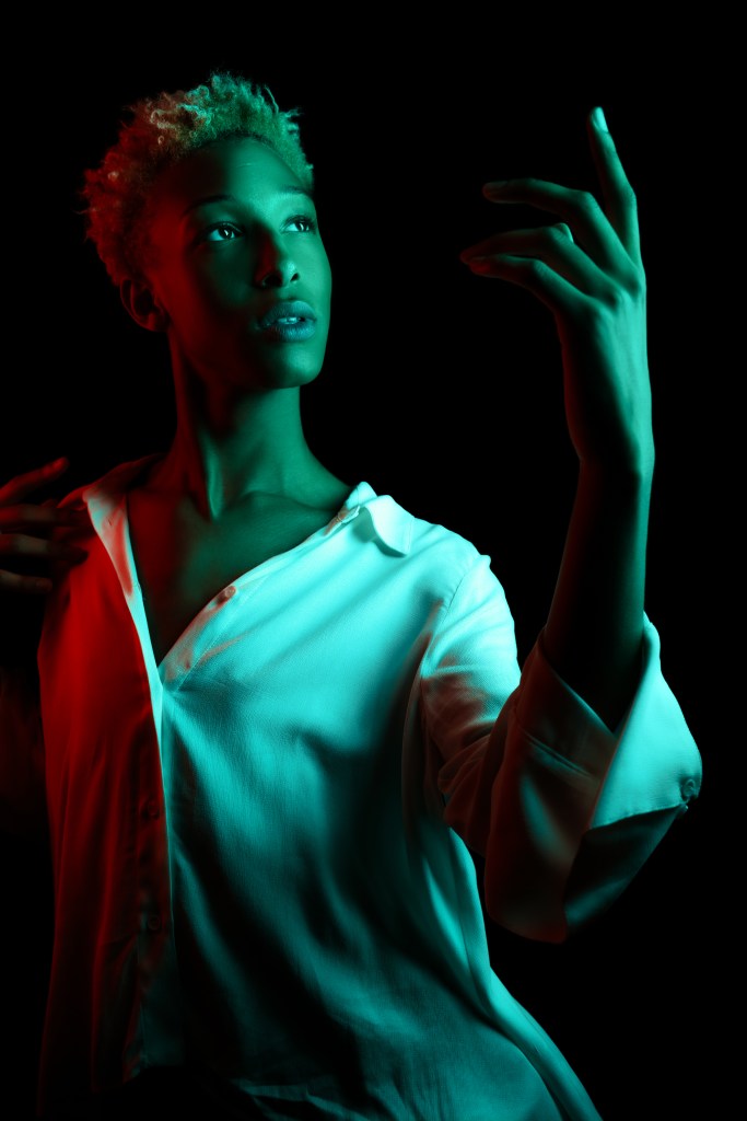 For the second shot, he used two 10″ x 36″ Stripboxes, one with a teal gel dome, and the other with a red. He faced the two stripboxes towards each other angled diagonally and put Daylan in the middle. This creates a very dramatic split lighting, made even more striking by the opposing colors!