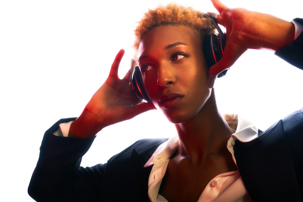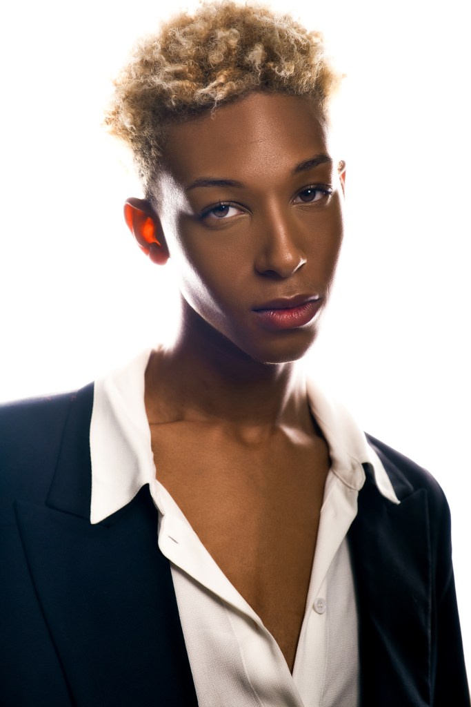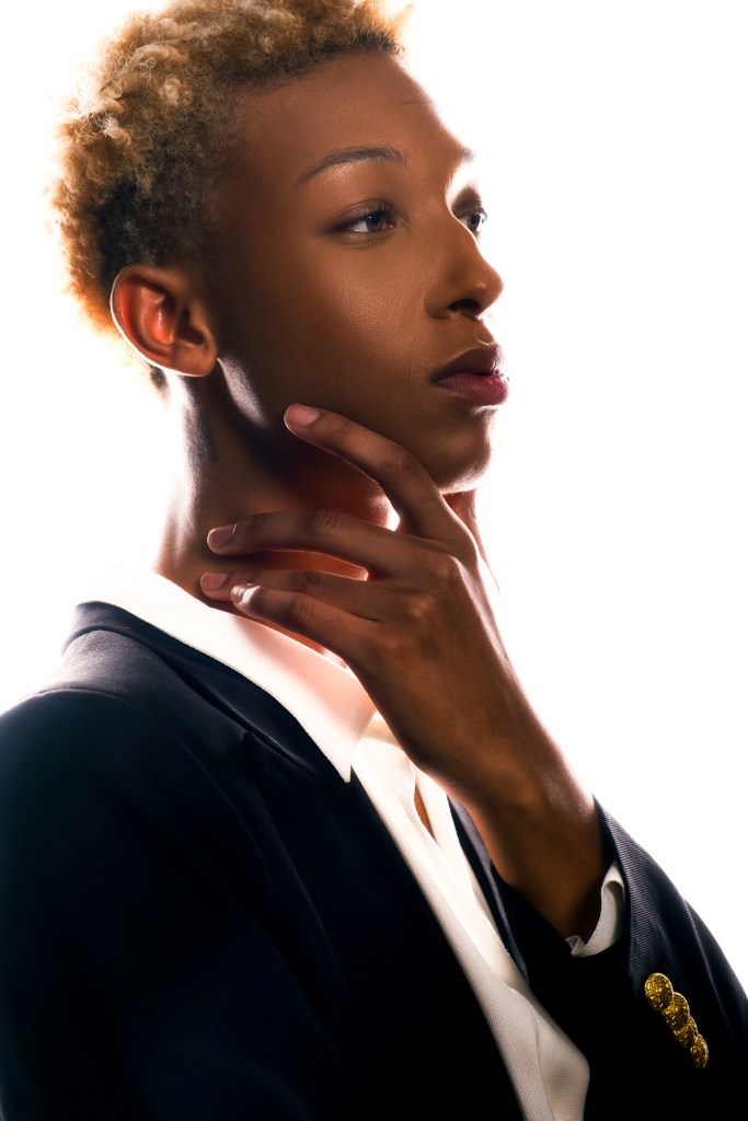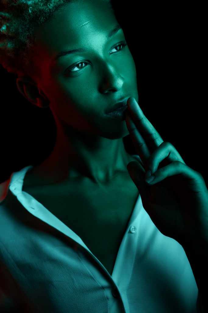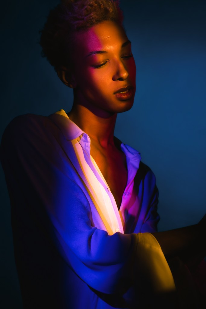 For the second shot, he used two 10″ x 36″ Stripboxes, one with a teal gel dome, and the other with a red. He faced the two stripboxes towards each other angled diagonally and put Daylan in the middle. This creates a very dramatic split lighting, made even more striking by the opposing colors!