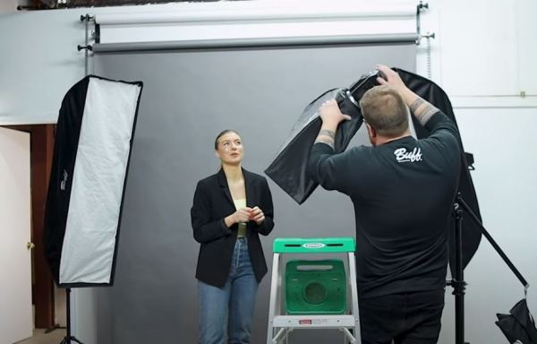 Next, Kyle positions two Celestials with 14″ x 60″ Foldable Stripboxes on either side of Emma. He put a 10″ x 36″ Stripbox on the key to light her face and provide unique catchlights in her eyes.