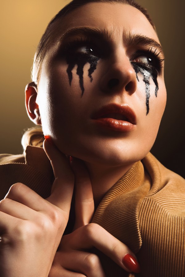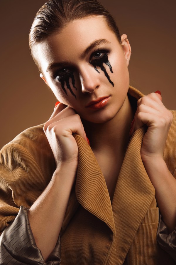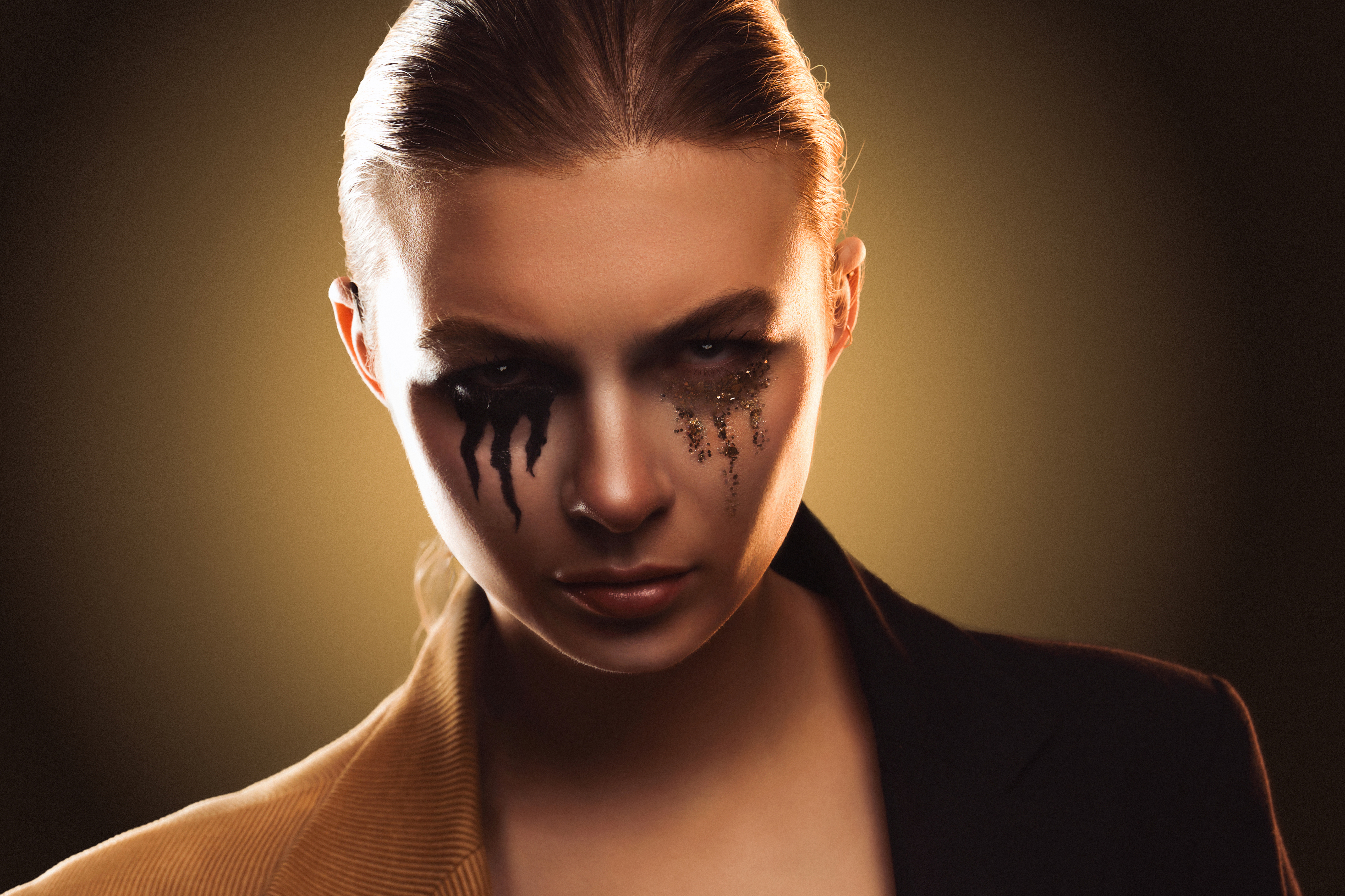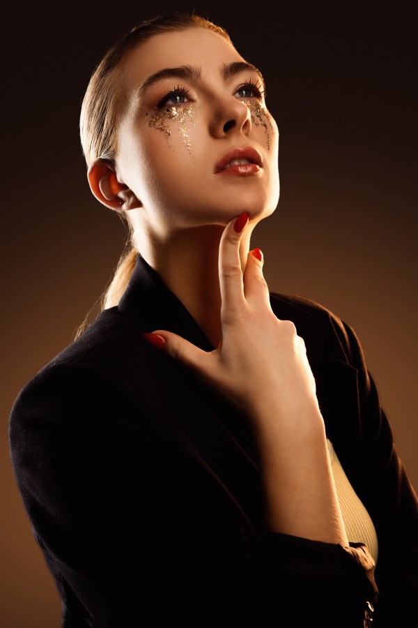 With the intent of creating a composite with the two makeup looks on either eye, this lighting setup stayed the same while Emma returned to hair and makeup to transform those gold tears into black, and change blazers.