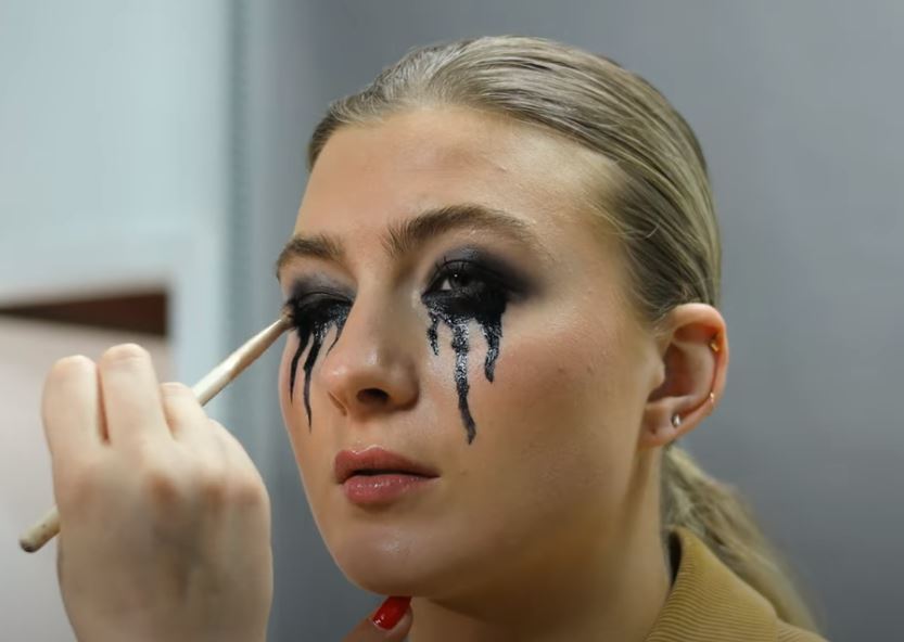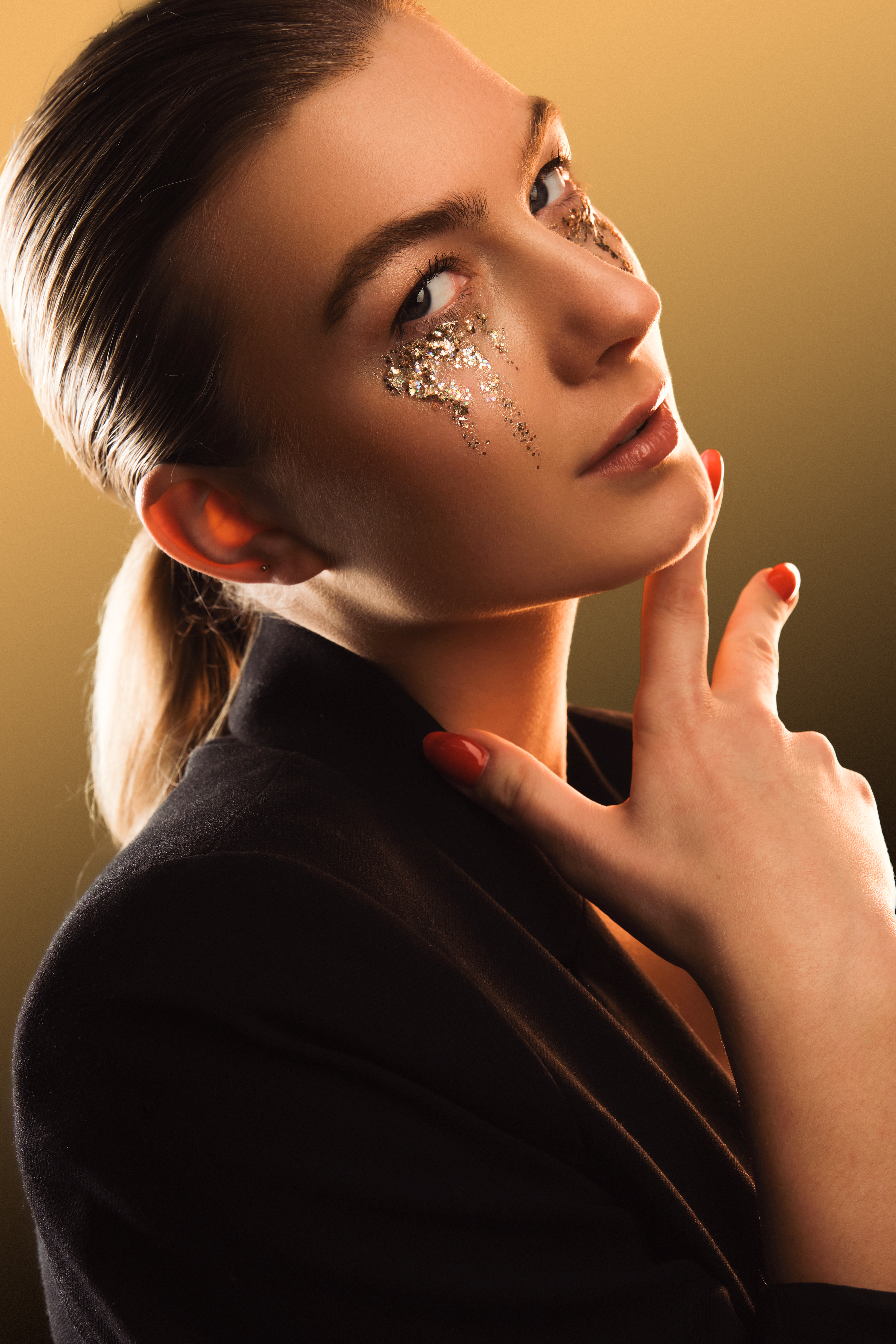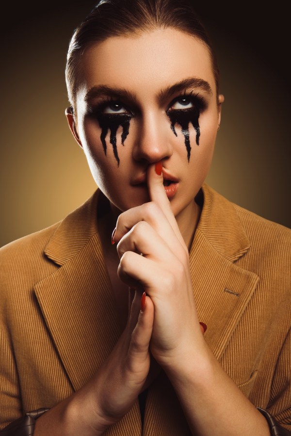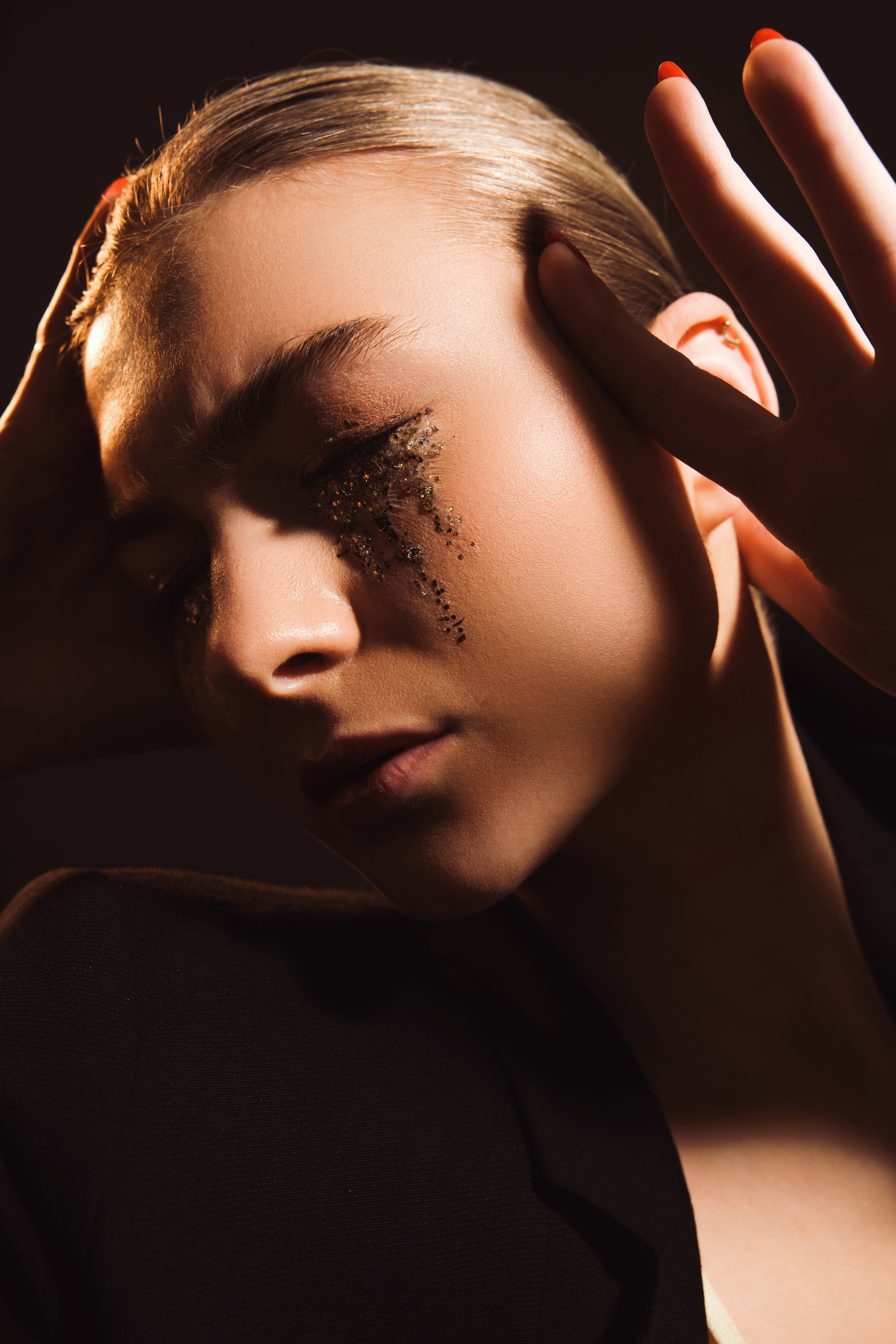 With the intent of creating a composite with the two makeup looks on either eye, this lighting setup stayed the same while Emma returned to hair and makeup to transform those gold tears into black, and change blazers.