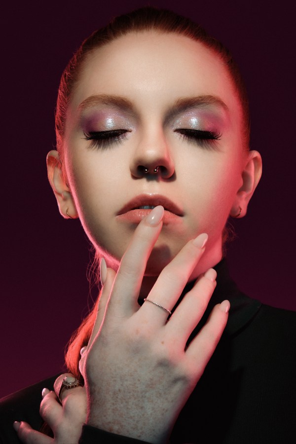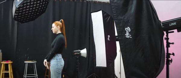 Directly behind the model, he placed a Celestial Flash Unit with a 7″ Reflector facing the backdrop.